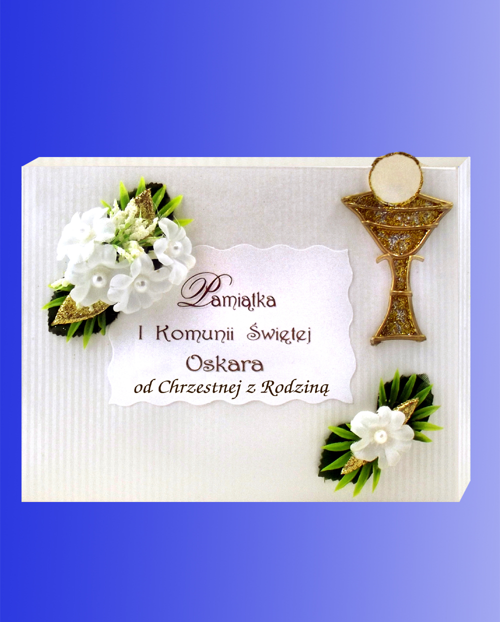 Wyjątkowa  koperta na prezent, banknoty  z okazji  I Komunii Świętej  – rękodzieło Premium w/g indywidualnego zamówienia klienta.  Koperta jest unikatowa: szeroka i bardzo elegancko, ręcznie zdobiona. Kopertę dekorujemy całkowicie ręcznie techniką kolażu dekoracji przestrzennej – rękodzieło artystyczne. Na  kopercie umieszczamy  piękną przestrzenną kompozycję z kwiatów materiałowych,  motyw dekoracyjny – obrazek lub bez oraz ozdobny, pamiątkowy napis. Każda koperta może być personalizowana poprzez wypisanie dla kogo i od kogo jest prezent. Personalizacja jest GRATIS .